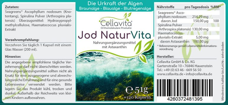 Die reichhaltigste Jodquelle der Natur sind Meeresalgen. Jod ist als essentielles Spurenelement nicht nur für die Schilddrüse sondern auch für viele andere Organe lebenswichtig. Natürliches Jod aus dem nordatlantischen Knotentang (Seagreens® Ascophyllum nodosum), hochwertiges Astaxanthin aus der Blutregenalge sowie weitere Wertvolle Bestandteile der Spirulina- Süßwasseralge bieten eine wertvolle Kombination.