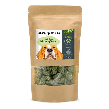 „Erbsen Spinat & Co“ ist ein kräftiges, rein pflanzliches Belohnungs-Leckerli für Hunde. Die Happen sind als Ergänzungsfuttermittel gedacht und passen ideal in einen bewusst gestalteten Fütterungsalltag – ob beim Training, auf Spaziergängen oder als kleine Belohnung zwischendurch.