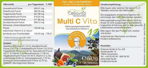 Beachten Sie, dass bei Multi C Vita nicht nur der reine, natürliche Vitamingehalt zählt: Die sieben Fruchtpulver haben eine enorme (schulwissenschaftlich nicht bekannte) Synergiewirkung durch ihre sich addierenden Molekularstrukturen!