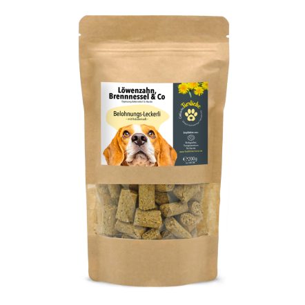 Das Belohnungs-Leckerli „Löwenzahn Brennnessel & Co“ ist ein pflanzenbetonter Snack für Hunde, der Gemüse mit ausgewählten Kräutern und Futterpflanzen verbindet. Die Happen sind als Ergänzungsfuttermittel gedacht und eignen sich ideal für Alltag, Training und kleine Belohnungsmomente zwischendurch.